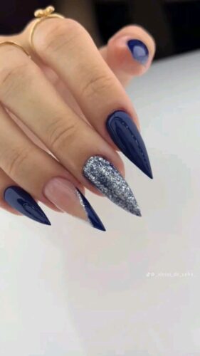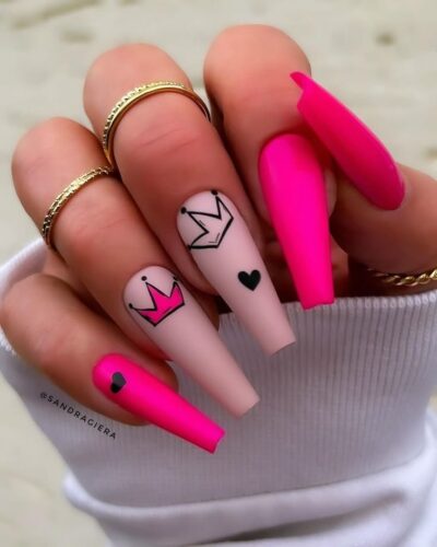 Coffin-shaped nails are bold and trendy. They provide a big canvas for detailed nail art, making them perfect for heart designs and glitter accents.